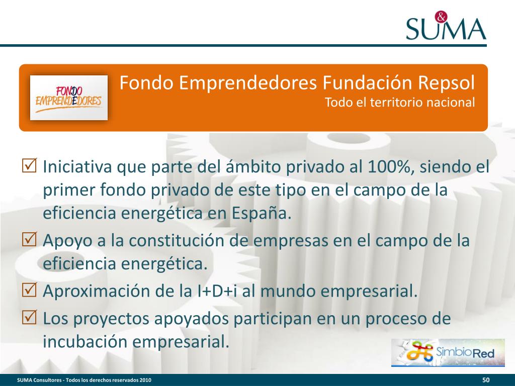 Fondo Emprendedores Fundación Repsol • Todo el territorio nacional • Iniciativa que parte del ámbito privado al 100%, siendo el primer fondo privado de este tipo en el campo de la eficiencia energética en España. • Apoyo a la constitución de empresas en el campo de la eficiencia energética. • Aproximación de la I+D+i al mundo empresarial. • Los proyectos apoyados participan en un proceso de incubación empresarial.