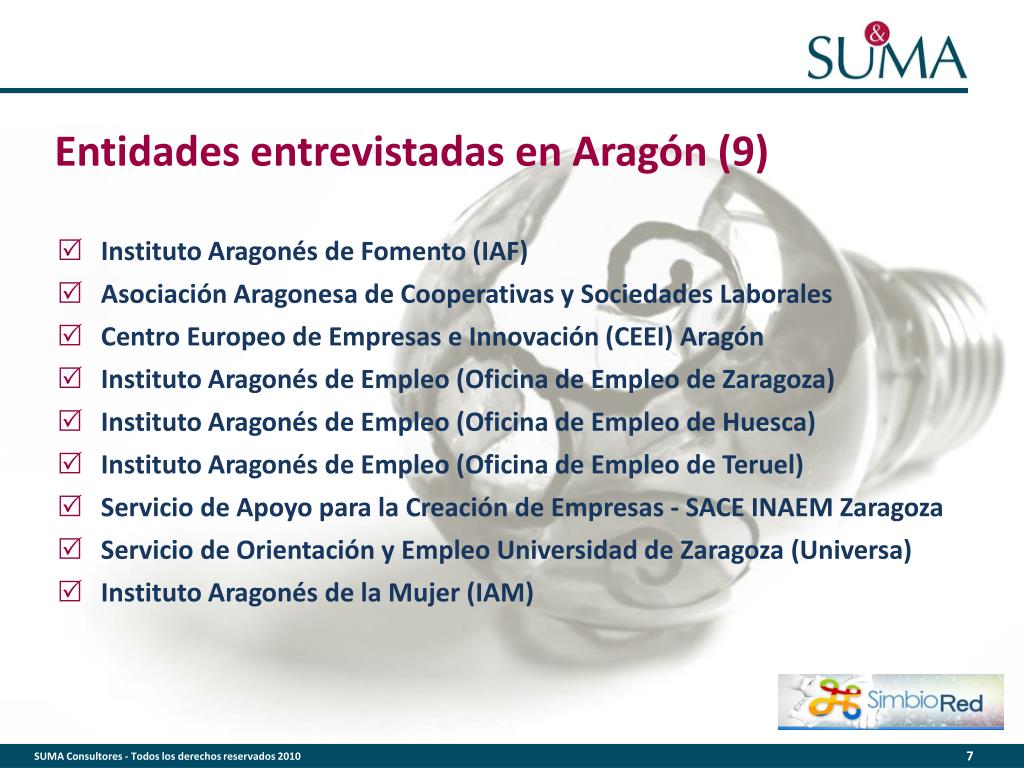 Entidades entrevistadas en Aragón (9) • Instituto Aragonés de Fomento (IAF) • Asociación Aragonesa de Cooperativas y Sociedades Laborales • Centro Europeo de Empresas e Innovación (CEEI) Aragón • Instituto Aragonés de Empleo (Oficina de Empleo de Zaragoza) • Instituto Aragonés de Empleo (Oficina de Empleo de Huesca) • Instituto Aragonés de Empleo (Oficina de Empleo de Teruel) • Servicio de Apoyo para la Creación de Empresas - SACE INAEM Zaragoza • Servicio de Orientación y Empleo Universidad de Zaragoza (Universa) • Instituto Aragonés de la Mujer (IAM)