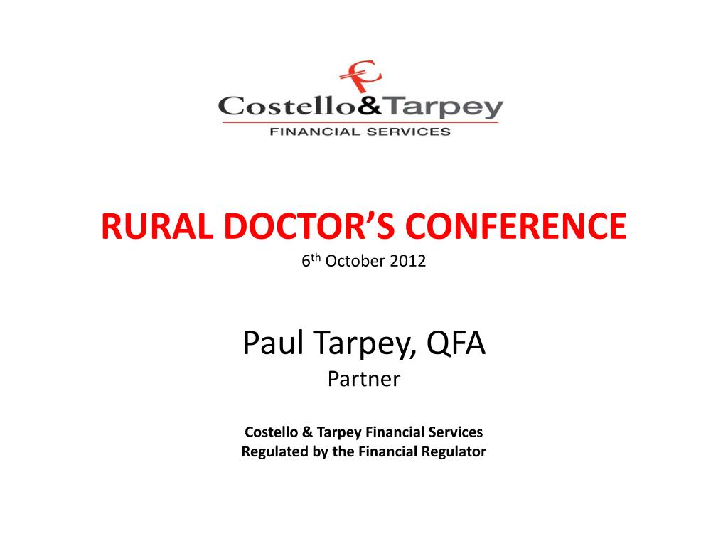 RURAL DOCTOR’S CONFERENCE6th October 2012Paul Tarpey, QFAPartner Costello & Tarpey Financial ServicesRegulated by the Financial RegulatorCOSTELLO & TARPEY FINANCIAL SERVICES, 27 BRIARHILL BUSINESS PARK ,BALLYBRIT, GALWAY.