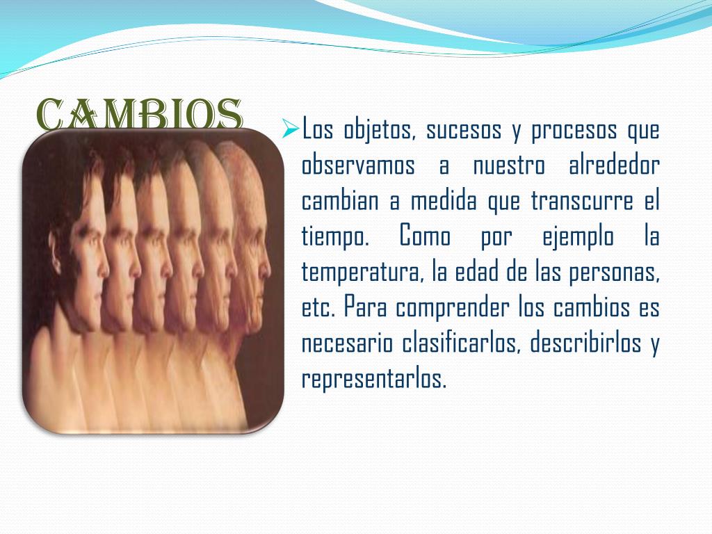 Cambios • Los objetos, sucesos y procesos que observamos a nuestro alrededor cambian a medida que transcurre el tiempo. Como por ejemplo la temperatura, la edad de las personas, etc. Para comprender los cambios es necesario clasificarlos, describirlos y representarlos.