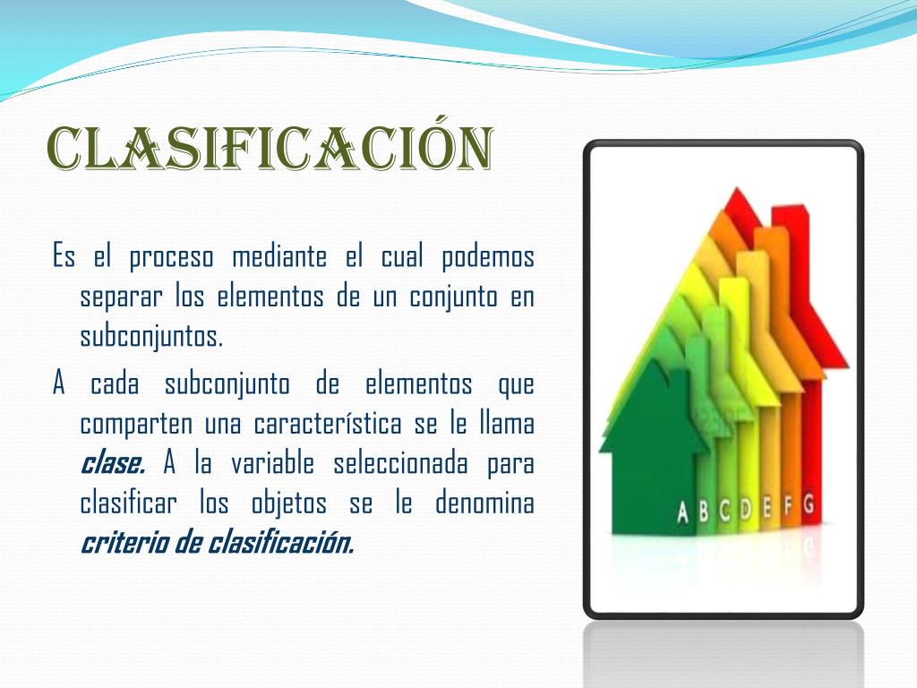 CLASIFICACIÓN Es el proceso mediante el cual podemos separar los elementos de un conjunto en subconjuntos. A cada subconjunto de elementos que comparten una característica se le llama clase. A la variable seleccionada para clasificar los objetos se le denomina criterio de clasificación.