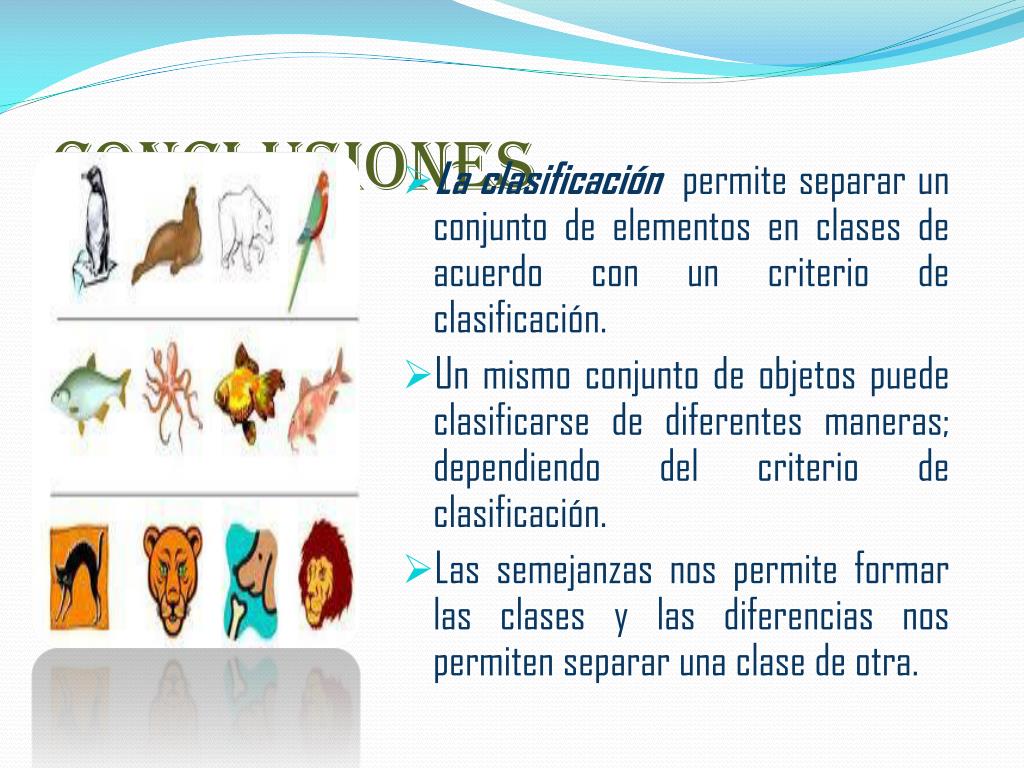conclusiones • La clasificación permite separar un conjunto de elementos en clases de acuerdo con un criterio de clasificación. • Un mismo conjunto de objetos puede clasificarse de diferentes maneras; dependiendo del criterio de clasificación. • Las semejanzas nos permite formar las clases y las diferencias nos permiten separar una clase de otra.