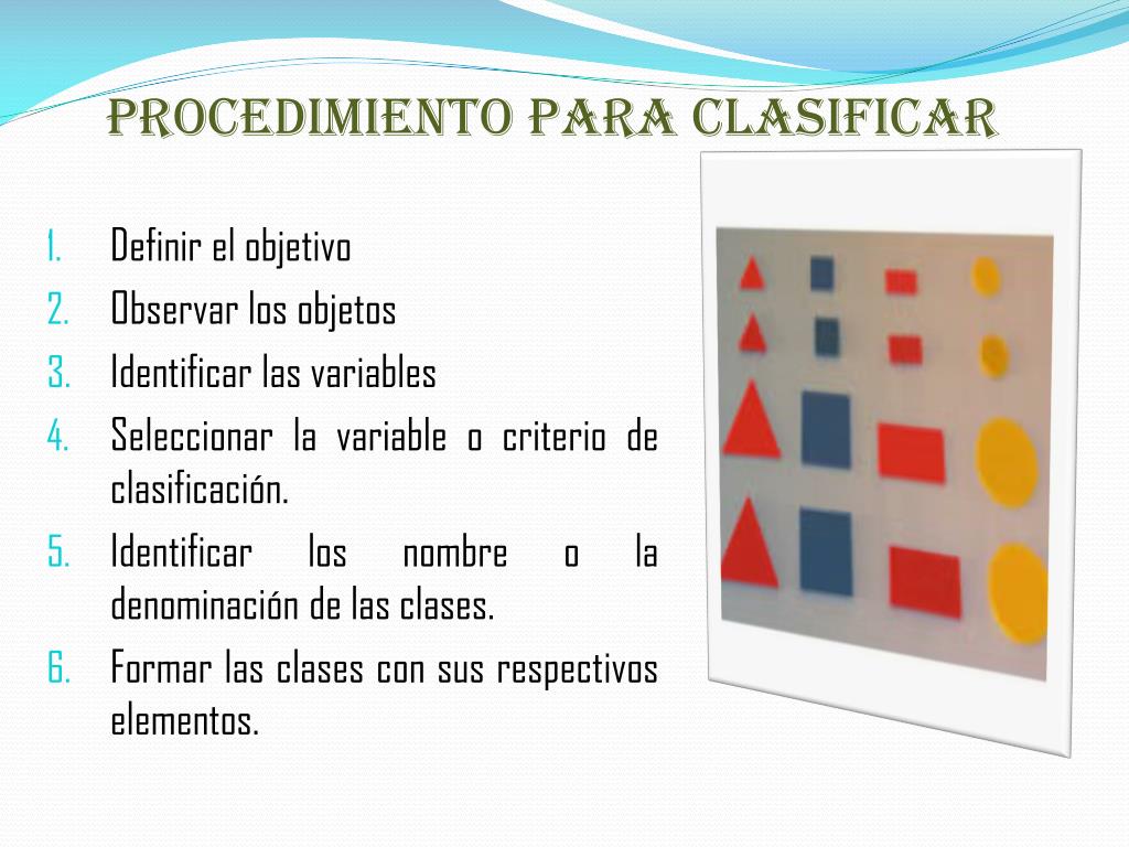 Procedimiento para clasificar • Definir el objetivo • Observar los objetos • Identificar las variables • Seleccionar la variable o criterio de clasificación. • Identificar los nombre o la denominación de las clases. • Formar las clases con sus respectivos elementos.