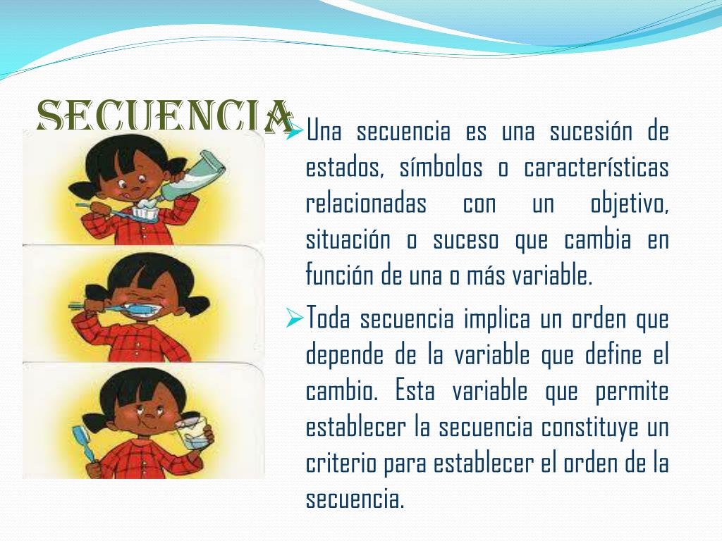 secuencia • Una secuencia es una sucesión de estados, símbolos o características relacionadas con un objetivo, situación o suceso que cambia en función de una o más variable. • Toda secuencia implica un orden que depende de la variable que define el cambio. Esta variable que permite establecer la secuencia constituye un criterio para establecer el orden de la secuencia.