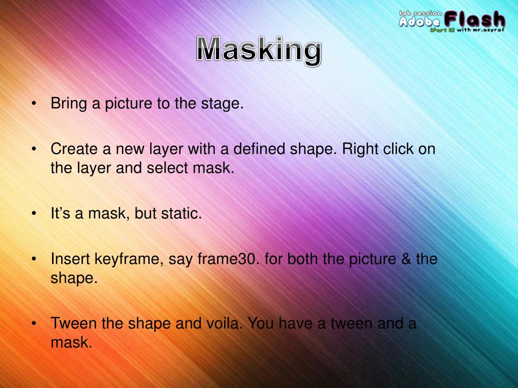 Masking • Bring a picture to the stage. • Create a new layer with a defined shape. Right click on the layer and select mask. • It’s a mask, but static. • Insert keyframe, say frame30. for both the picture & the shape. • Tweenthe shape and voila. You have a tween and a mask.