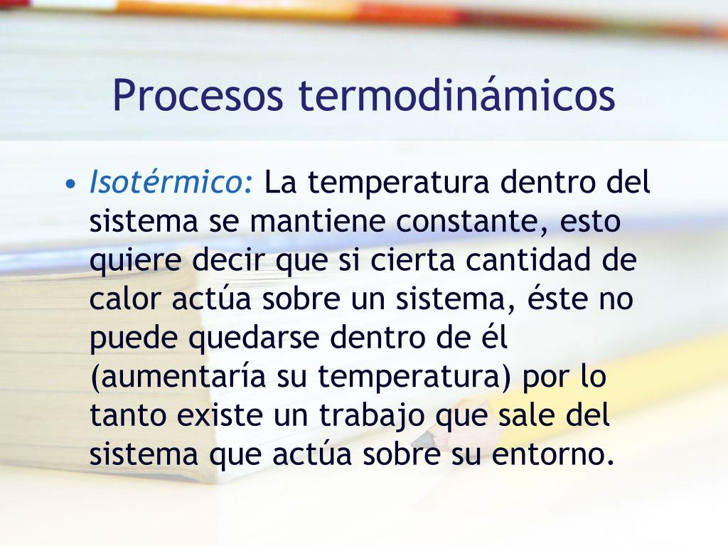 Procesos termodinámicos • Isotérmico: La temperatura dentro del sistema se mantiene constante, esto quiere decir que si cierta cantidad de calor actúa sobre un sistema, éste no puede quedarse dentro de él (aumentaría su temperatura) por lo tanto existe un trabajo que sale del sistema que actúa sobre su entorno.