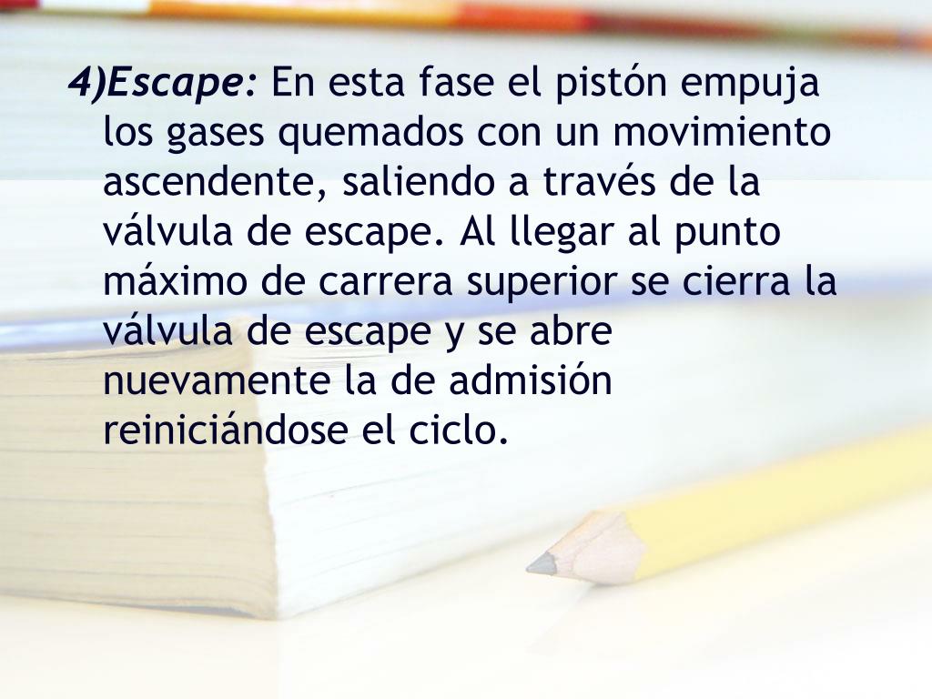 4)Escape: En esta fase el pistón empuja los gases quemados con un movimiento ascendente, saliendo a través de la válvula de escape. Al llegar al punto máximo de carrera superior se cierra la válvula de escape y se abre nuevamente la de admisión reiniciándose el ciclo.