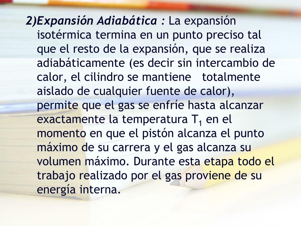 2)Expansión Adiabática : La expansión isotérmica termina en un punto preciso tal que el resto de la expansión, que se realiza adiabáticamente (es decir sin intercambio de calor, el cilindro se mantiene totalmente aislado de cualquier fuente de calor), permite que el gas se enfríe hasta alcanzar exactamente la temperatura T1 en el momento en que el pistón alcanza el punto máximo de su carrera y el gas alcanza su volumen máximo. Durante esta etapa todo el trabajo realizado por el gas proviene de su energía interna.