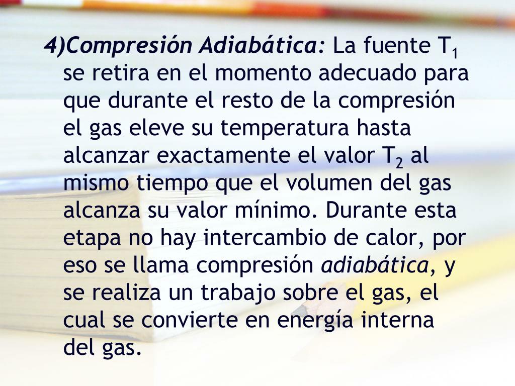 4)Compresión Adiabática: La fuente T1 se retira en el momento adecuado para que durante el resto de la compresión el gas eleve su temperatura hasta alcanzar exactamente el valor T2 al mismo tiempo que el volumen del gas alcanza su valor mínimo. Durante esta etapa no hay intercambio de calor, por eso se llama compresión adiabática, y se realiza un trabajo sobre el gas, el cual se convierte en energía interna del gas.