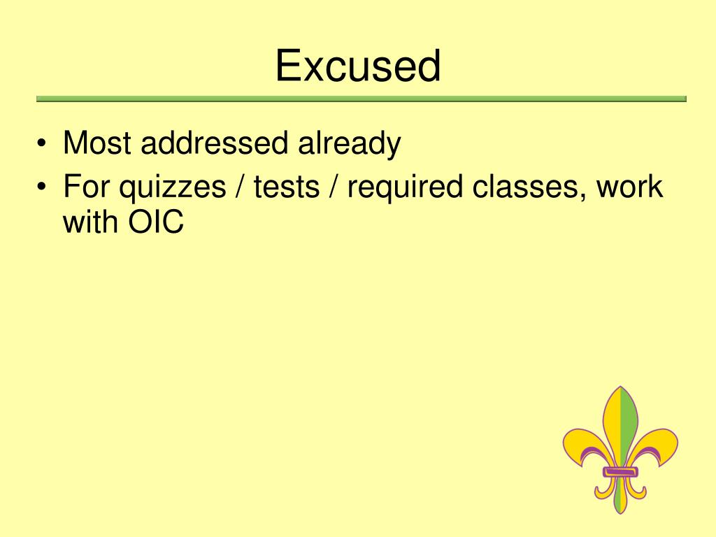 Excused • Most addressed already • For quizzes / tests / required classes, work with OIC