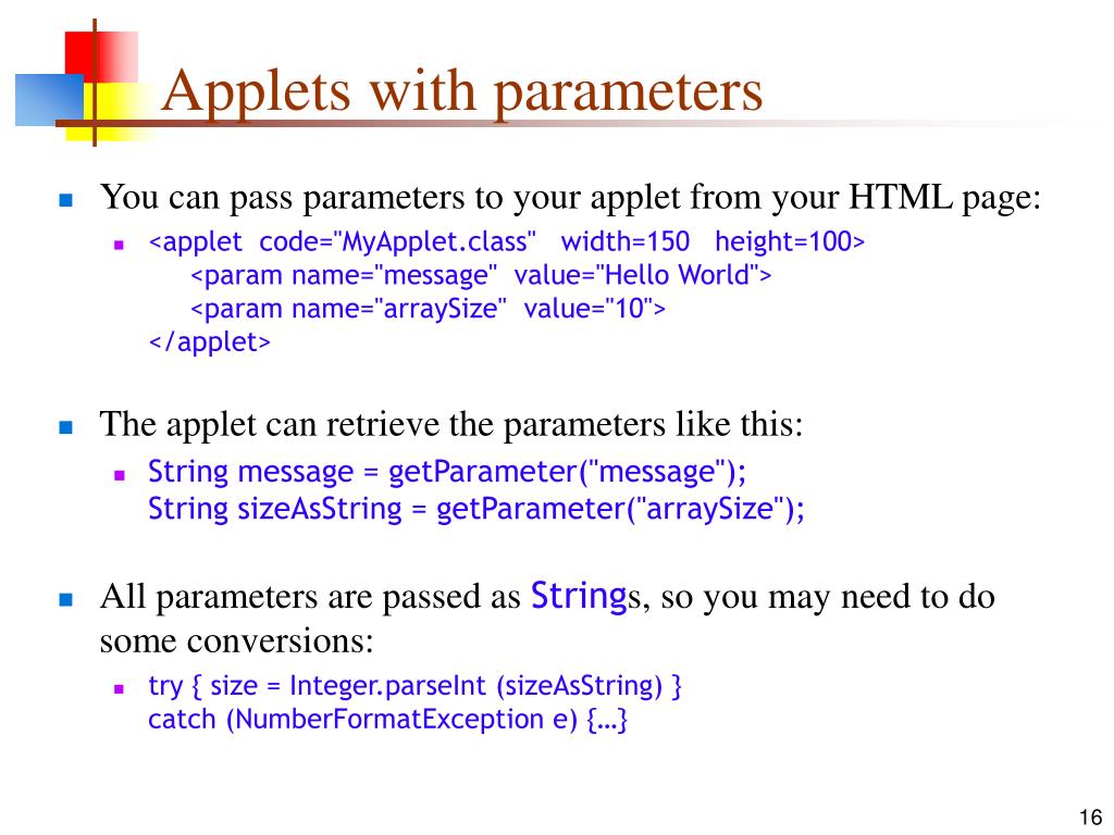 Applets with parameters • You can pass parameters to your applet from your HTML page: • <applet code="MyApplet.class" width=150 height=100> <param name="message" value="Hello World"> <param name="arraySize" value="10"></applet> • The applet can retrieve the parameters like this: • String message = getParameter("message");String sizeAsString = getParameter("arraySize"); • All parameters are passed as Strings, so you may need to do some conversions: • try { size = Integer.parseInt (sizeAsString) }catch (NumberFormatException e) {…}