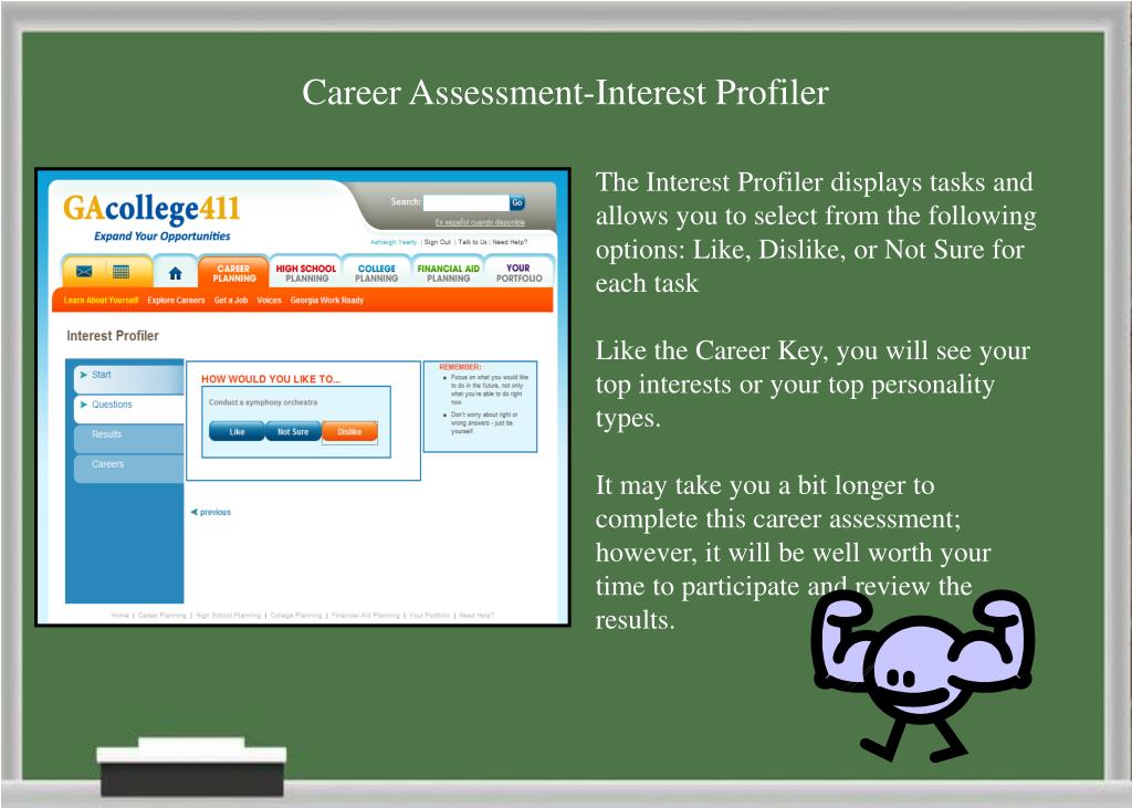 Career Assessment-Interest Profiler The Interest Profiler displays tasks and allows you to select from the following options: Like, Dislike, or Not Sure for each task Like the Career Key, you will see your top interests or your top personality types. It may take you a bit longer to complete this career assessment; however, it will be well worth your time to participate and review the results.