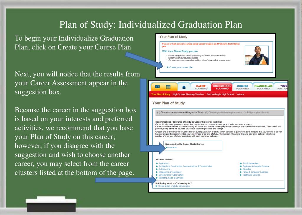Plan of Study: Individualized Graduation Plan To begin your Individualize Graduation Plan, click on Create your Course Plan Next, you will notice that the results from your Career Assessment appear in the suggestion box. Because the career in the suggestion box is based on your interests and preferred activities, we recommend that you base your Plan of Study on this career; however, if you disagree with the suggestion and wish to choose another career, you may select from the career clusters listed at the bottom of the page.