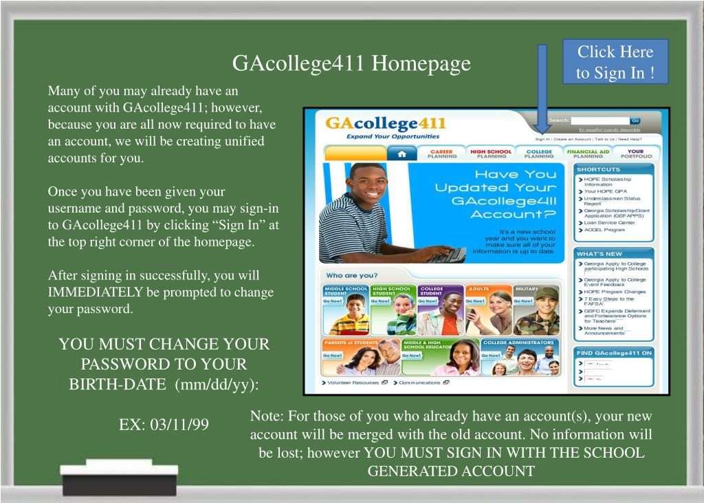 Click Here to Sign In ! GAcollege411 Homepage Many of you may already have an account with GAcollege411; however, because you are all now required to have an account, we will be creating unified accounts for you. Once you have been given your username and password, you may sign-in to GAcollege411 by clicking “Sign In” at the top right corner of the homepage. After signing in successfully, you will IMMEDIATELY be prompted to change your password. YOU MUST CHANGE YOUR PASSWORD TO YOUR BIRTH-DATE (mm/dd/yy): EX: 03/11/99 Note: For those of you who already have an account(s), your new account will be merged with the old account. No information will be lost; however YOU MUST SIGN IN WITH THE SCHOOL GENERATED ACCOUNT