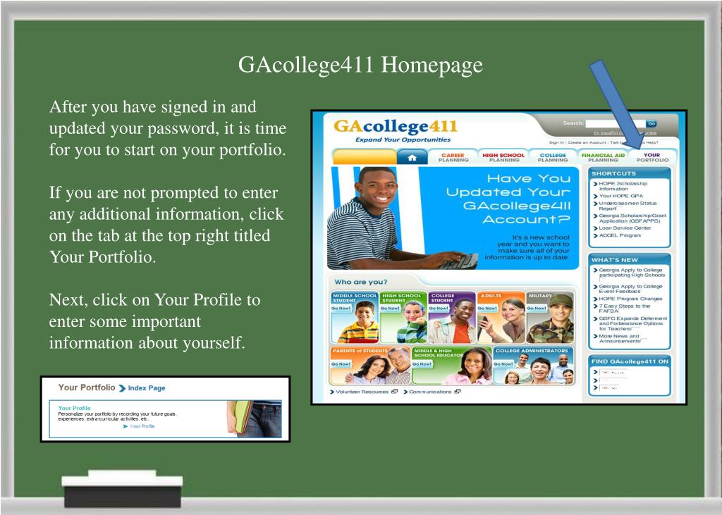 GAcollege411 Homepage After you have signed in and updated your password, it is time for you to start on your portfolio. If you are not prompted to enter any additional information, click on the tab at the top right titled Your Portfolio. Next, click on Your Profile to enter some important information about yourself.