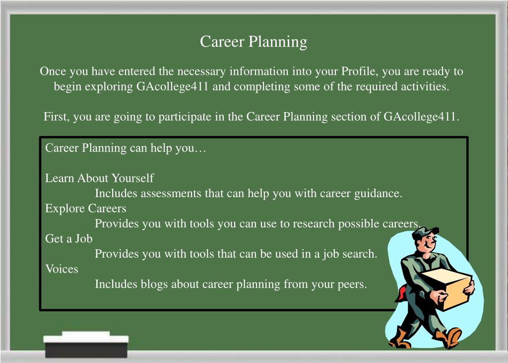 Career Planning Once you have entered the necessary information into your Profile, you are ready to begin exploring GAcollege411 and completing some of the required activities. First, you are going to participate in the Career Planning section of GAcollege411. Career Planning can help you… Learn About Yourself Includes assessments that can help you with career guidance. Explore Careers Provides you with tools you can use to research possible careers. Get a Job Provides you with tools that can be used in a job search. Voices Includes blogs about career planning from your peers.