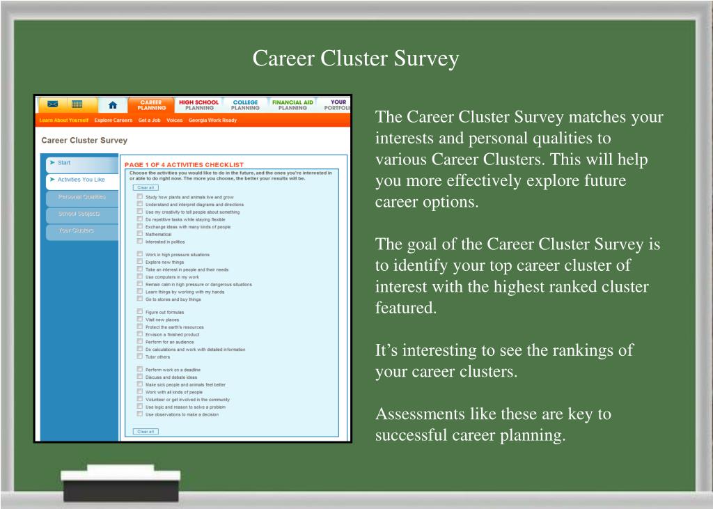Career Cluster Survey The Career Cluster Survey matches your interests and personal qualities to various Career Clusters. This will help you more effectively explore future career options. The goal of the Career Cluster Survey is to identify your top career cluster of interest with the highest ranked cluster featured. It’s interesting to see the rankings of your career clusters. Assessments like these are key to successful career planning.