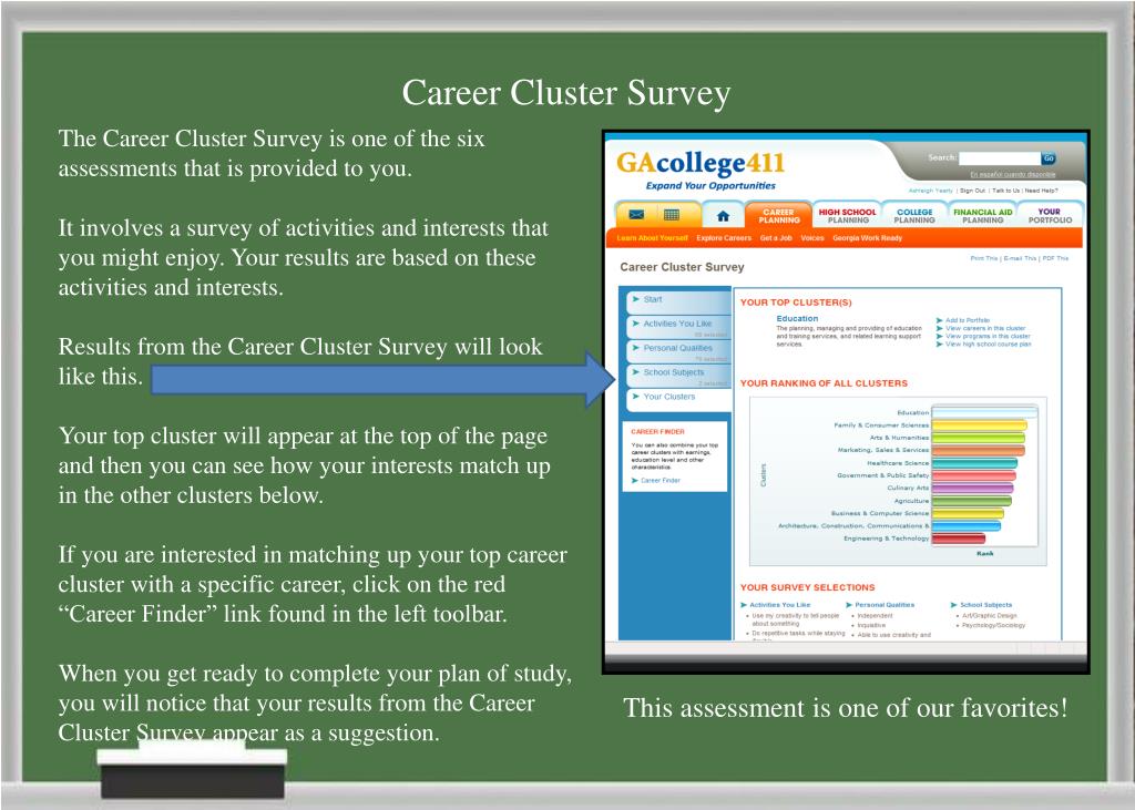 Career Cluster Survey The Career Cluster Survey is one of the six assessments that is provided to you. It involves a survey of activities and interests that you might enjoy. Your results are based on these activities and interests. Results from the Career Cluster Survey will look like this. Your top cluster will appear at the top of the page and then you can see how your interests match up in the other clusters below. If you are interested in matching up your top career cluster with a specific career, click on the red “Career Finder” link found in the left toolbar. When you get ready to complete your plan of study, you will notice that your results from the Career Cluster Survey appear as a suggestion. This assessment is one of our favorites!