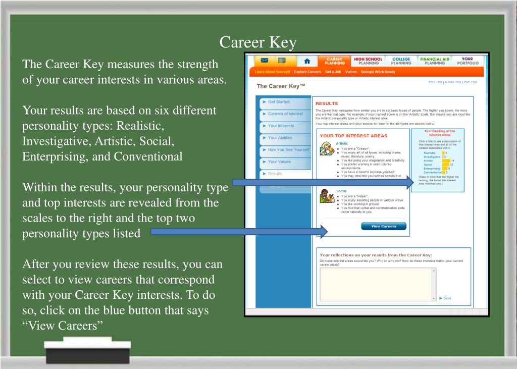 Career Key The Career Key measures the strength of your career interests in various areas. Your results are based on six different personality types: Realistic, Investigative, Artistic, Social, Enterprising, and Conventional Within the results, your personality type and top interests are revealed from the scales to the right and the top two personality types listed After you review these results, you can select to view careers that correspond with your Career Key interests. To do so, click on the blue button that says “View Careers”