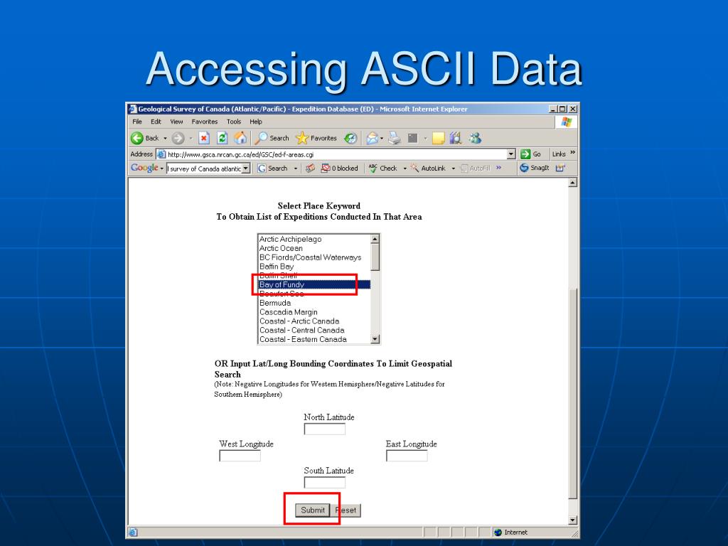 Bringing ASCII data into ArcMap Step 1 – Get data • To bring text data into ArcMap, data must be in either .dbf format (DBase) or .csv (comma separated/delimited). • Conversion to either of these formats can be done through Microsoft Excel * Recommend .csv as there is usually fewer formatting issues. • Go to: http://ed.gdr.nrcan.gc.ca/GSC/ed-f-menu.cgi User name: edonline Password: edonline