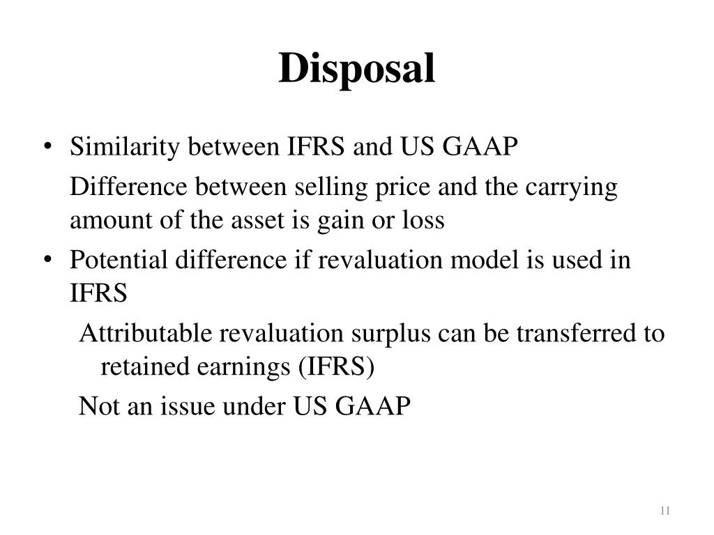 Disposal • Similarity between IFRS and US GAAP Difference between selling price and the carrying amount of the asset is gain or loss • Potential difference if revaluation model is used in IFRS Attributable revaluation surplus can be transferred to retained earnings (IFRS) Not an issue under US GAAP