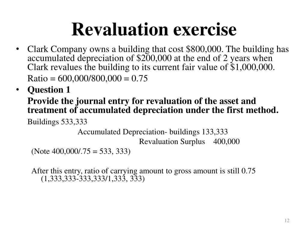 Revaluation exercise • Clark Company owns a building that cost $800,000. The building has accumulated depreciation of $200,000 at the end of 2 years when Clark revalues the building to its current fair value of $1,000,000. Ratio = 600,000/800,000 = 0.75 • Question 1 Provide the journal entry for revaluation of the asset and treatment of accumulated depreciation under the first method. Buildings 533,333 • Accumulated Depreciation- buildings 133,333 • Revaluation Surplus 400,000 • (Note 400,000/.75 = 533, 333) • After this entry, ratio of carrying amount to gross amount is still 0.75 (1,333,333-333,333/1,333, 333)