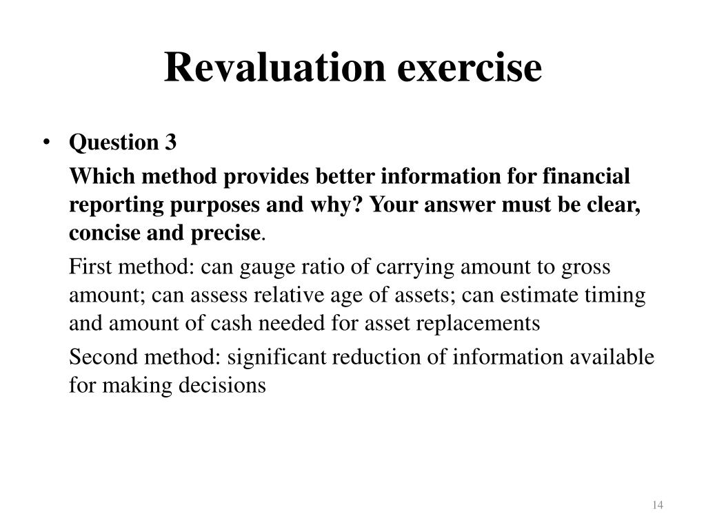 Revaluation exercise • Question 3 Which method provides better information for financial reporting purposes and why? Your answer must be clear, concise and precise. First method: can gauge ratio of carrying amount to gross amount; can assess relative age of assets; can estimate timing and amount of cash needed for asset replacements Second method: significant reduction of information available for making decisions