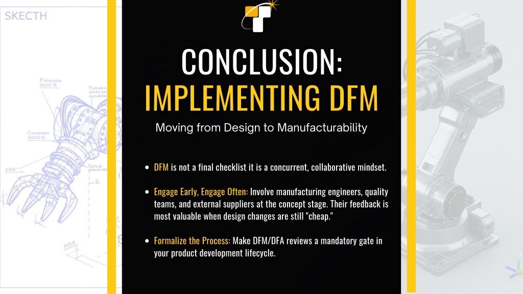 CONCLUSION: IMPLEMENTING DFM Moving from Design to Manufacturability DFM is not a final checklist it is a concurrent, collaborative mindset. Engage Early, Engage Often: Involve manufacturing engineers, quality teams, and external suppliers at the concept stage. Their feedback is most valuable when design changes are still "cheap." Formalize the Process: Make DFM/DFA reviews a mandatory gate in your product development lifecycle.