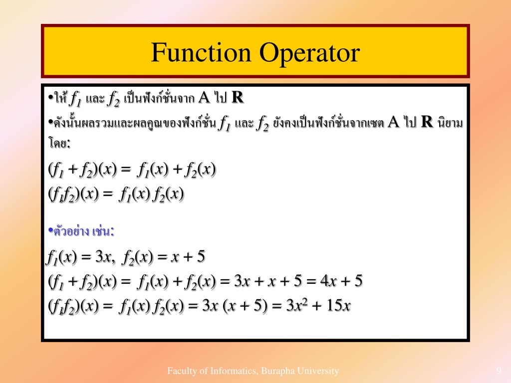 Function Operator • ให้f1และf2เป็นฟังก์ชั่นจาก A ไปR • ดังนั้นผลรวมและผลคูณของฟังก์ชั่นf1และf2ยังคงเป็นฟังก์ชั่นจากเซต A ไปRนิยามโดย: (f1 + f2)(x) = f1(x) + f2(x) (f1f2)(x) = f1(x) f2(x) • ตัวอย่าง เช่น: f1(x) = 3x, f2(x) = x + 5 (f1+ f2)(x) = f1(x) + f2(x) = 3x + x + 5 = 4x + 5 (f1f2)(x) = f1(x) f2(x) = 3x (x + 5) = 3x2 + 15x Faculty of Informatics, Burapha University
