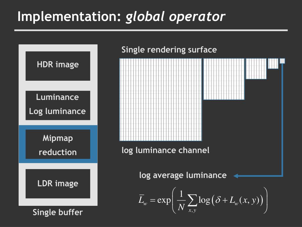 Implementation: global operator • Single rendering surface • HDR image • Luminance • Log luminance • Mipmap • reduction • log luminance channel • log average luminance • LDR image • Single buffer