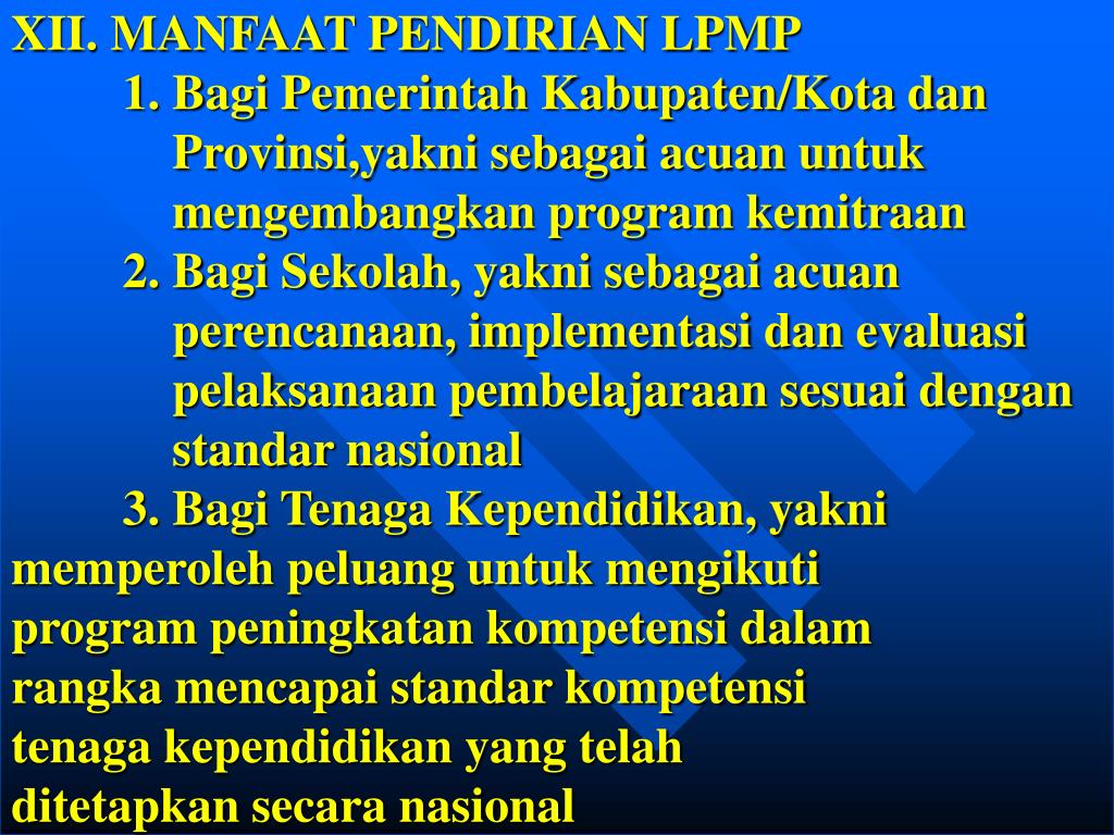 XII. MANFAAT PENDIRIAN LPMP 1. Bagi Pemerintah Kabupaten/Kota dan Provinsi,yakni sebagai acuan untuk mengembangkan program kemitraan 2. Bagi Sekolah, yakni sebagai acuan perencanaan, implementasi dan evaluasi pelaksanaan pembelajaraan sesuai dengan standar nasional 3. Bagi Tenaga Kependidikan, yakni memperoleh peluang untuk mengikuti program peningkatan kompetensi dalam rangka mencapai standar kompetensi tenaga kependidikan yang telah ditetapkan secara nasional