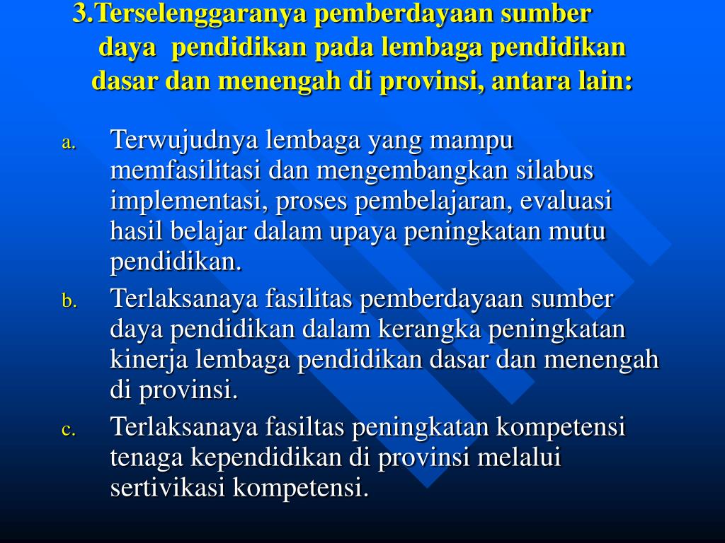 3.Terselenggaranya pemberdayaan sumber daya pendidikan pada lembaga pendidikan dasar dan menengah di provinsi, antara lain: • Terwujudnya lembaga yang mampu memfasilitasi dan mengembangkan silabus implementasi, proses pembelajaran, evaluasi hasil belajar dalam upaya peningkatan mutu pendidikan. • Terlaksanaya fasilitas pemberdayaan sumber daya pendidikan dalam kerangka peningkatan kinerja lembaga pendidikan dasar dan menengah di provinsi. • Terlaksanaya fasiltas peningkatan kompetensi tenaga kependidikan di provinsi melalui sertivikasi kompetensi.