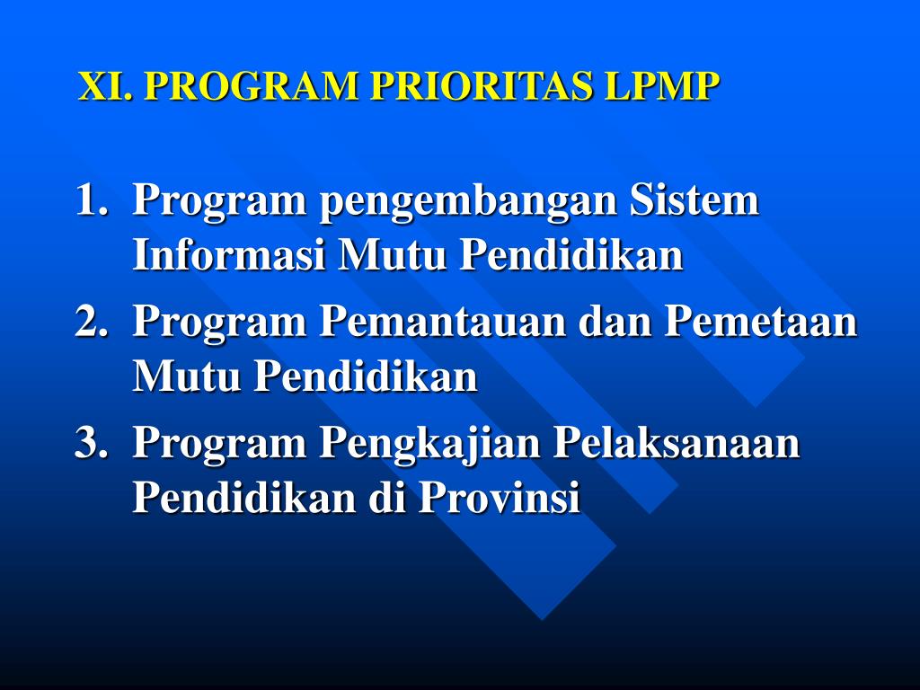 XI. PROGRAM PRIORITAS LPMP 1. Program pengembangan Sistem Informasi Mutu Pendidikan 2. Program Pemantauan dan Pemetaan Mutu Pendidikan 3. Program Pengkajian Pelaksanaan Pendidikan di Provinsi