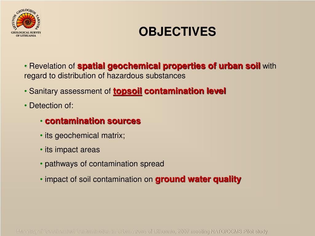MAPPING OF GEOCHEMICAL C ONTAMINATION IN URBAN AREAS OF LITHUANIA Virgilija Gregorauskienė Lithuanian Geological Survey. M apping of Geochemical Contamination in Urban Areas of Lithuania, 2007 meeting NATO/CCMS Pilot study. OBJECTIVES.