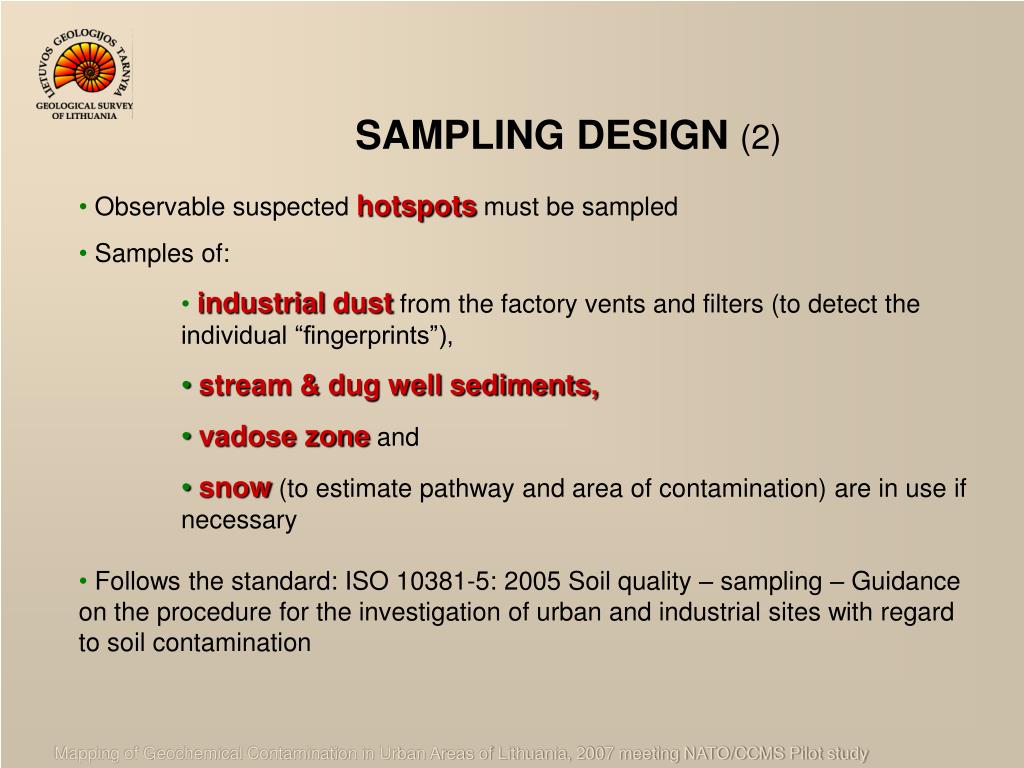 SAMPLING DESIGN (2) • Observable suspected hotspots must be sampled • Samples of: • industrialdust from the factory vents and filters (to detect the individual “fingerprints”), • stream & dug well sediments, • vadose zone and • snow (to estimate pathway and area of contamination) are in use if necessary • Follows the standard: ISO 10381-5: 2005 Soil quality – sampling – Guidance on the procedure for the investigation of urban and industrial sites with regard to soil contamination Mapping of Geochemical Contamination in Urban Areas of Lithuania, 2007 meeting NATO/CCMS Pilot study