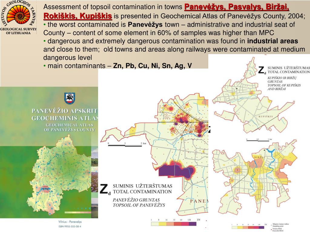 Assessment of topsoil contamination level at every urban area is carried out in comparable way, i.e. using element contents versusbackground values Background values of elements in soil of various texture (sand, loamy sand, loam, clay, peat), different genesis (glacial, glaciofluvial, glaciolacustrine) and of different administrative districts are published in Geochemical Atlas of Lithuania, 1999 Mapping of Geochemical Contamination in Urban Areas of Lithuania, 2007 meeting NATO/CCMS Pilot study