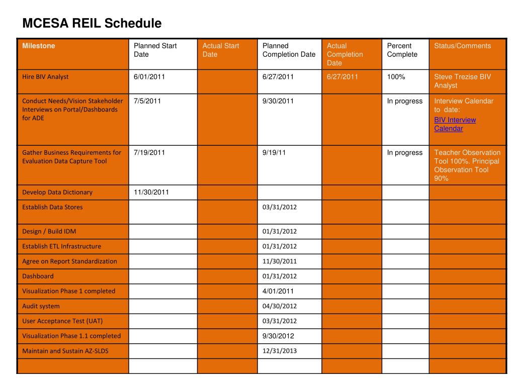 IT: AZ-SLDS:MCESA REIL July 2011 Scope and Objectives • ADE/MCESA will meet the MCESA REIL grant objective. This will be done by: • A teacher Identifier system with ability to match teachers to students • Sample Use Case: Student “A” is assigned to Teacher “1” and Teacher “2”. The project will map Student “A” to both Teacher “1” and Teacher “2” • Student level transcript information, including courses completed and grades earned • Ensure students graduate college-ready by increasing student achievement and growth in all content areas • Enhance careers for effective teachers and principals by implementing a fiscally sustainable, performance-based compensation system • Develop talent in teaching and leading through a sustainable, comprehensive program of performance-based evaluation and support • Migration of the student/teacher/course data from district level SIS systems and HR systems for a specified job time to be pushed to ADE portal to Relational Database System potentially utilizing SQL Server Integration Services (SSIS) packages as transformations solutions Project Status Milestones Achievements Past Month Plans Next Month • In the process of gathering requirements on Evaluation Data Capture tool for REIL • Discovery with REIL team on further products that are components of the REIL Data Management System (DMS) • Finalizing IGA • Visualization requirements working sessions with MCESA stakeholders • Draft Portal/Dashboard BI requirements documentation • Finalize project schedule • Finalize Project Management Plan Risks / Issues / Change Requests