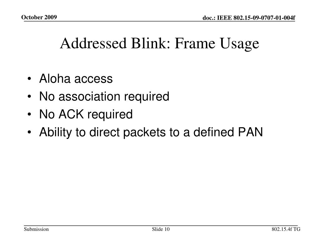 Addressed Blink: Frame Usage • Aloha access • No association required • No ACK required • Ability to direct packets to a defined PAN 802.15.4f TG