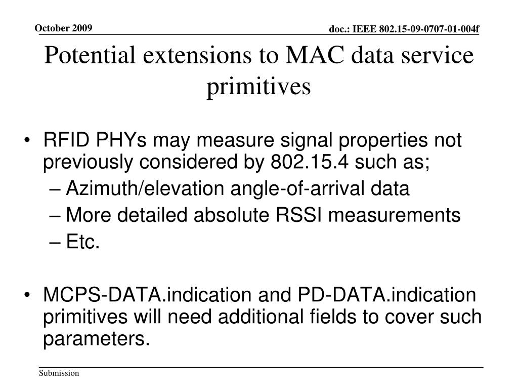 October 2009 Potential extensions to MAC data service primitives • RFID PHYs may measure signal properties not previously considered by 802.15.4 such as; • Azimuth/elevation angle-of-arrival data • More detailed absolute RSSI measurements • Etc. • MCPS-DATA.indication and PD-DATA.indication primitives will need additional fields to cover such parameters.