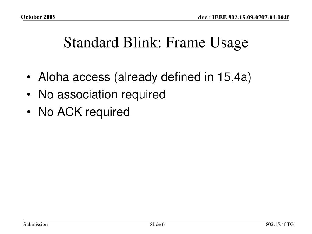Standard Blink: Frame Usage • Aloha access (already defined in 15.4a) • No association required • No ACK required 802.15.4f TG