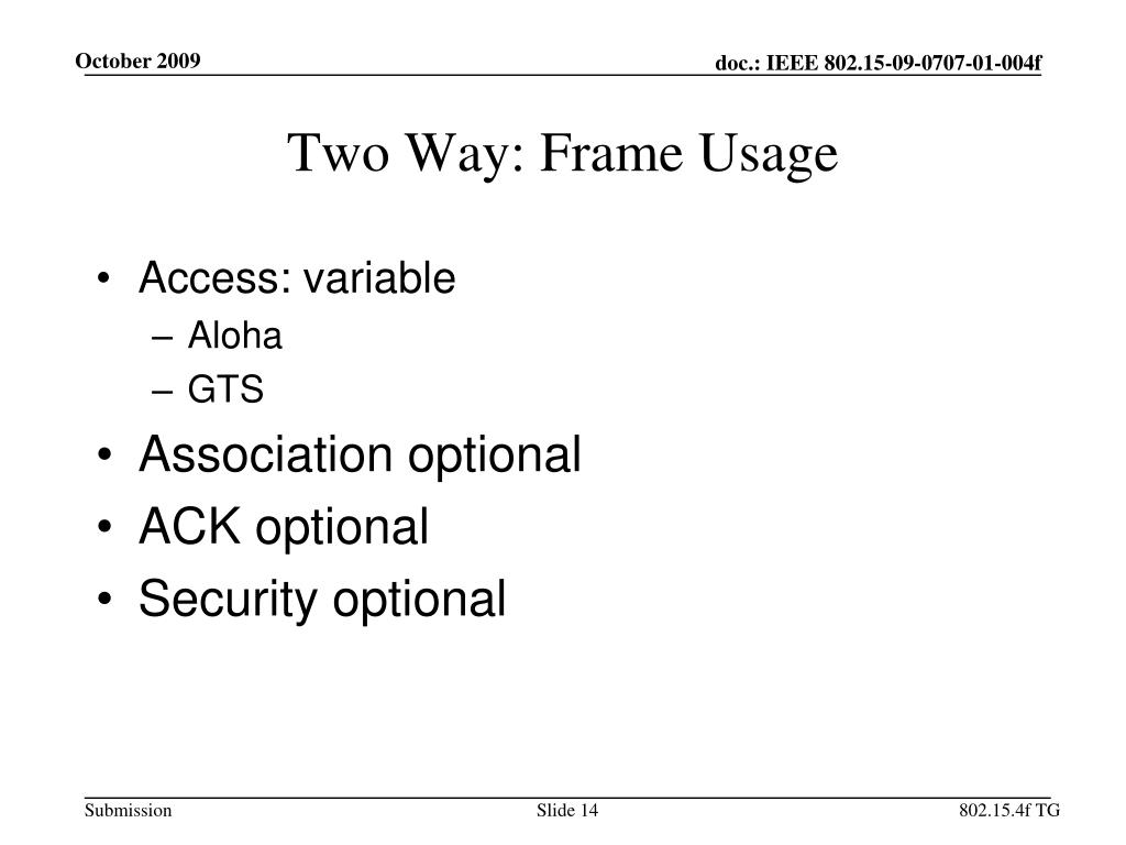 Two Way: Frame Usage • Access: variable • Aloha • GTS • Association optional • ACK optional • Security optional 802.15.4f TG