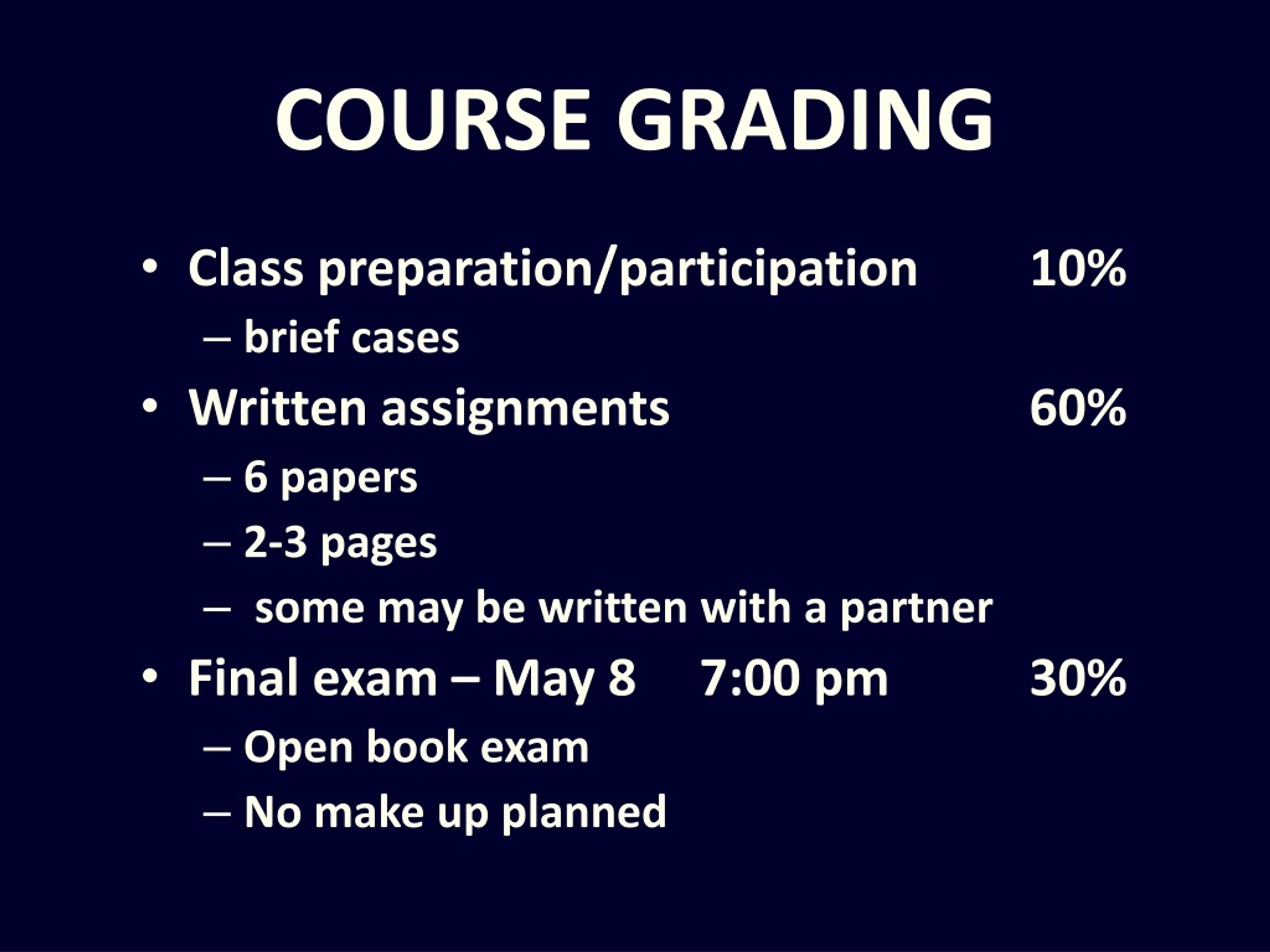 COURSE GRADING • Class preparation/participation 10% • brief cases • Written assignments 60% • 6 papers • 2-3 pages • some may be written with a partner • Final exam – May 8 7:00 pm 30% • Open book exam • No make up planned