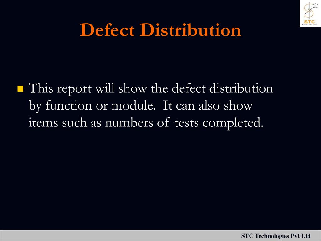 Defect Distribution • This report will show the defect distribution by function or module. It can also show items such as numbers of tests completed.