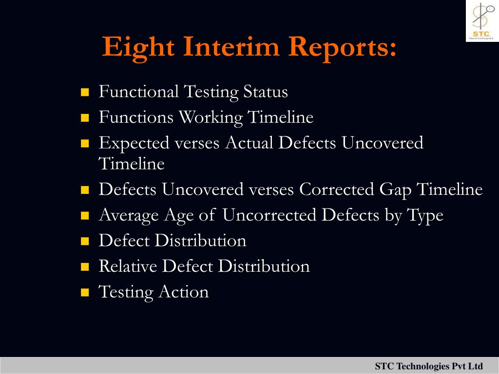 Eight Interim Reports: • Functional Testing Status • Functions Working Timeline • Expected verses Actual Defects Uncovered Timeline • Defects Uncovered verses Corrected Gap Timeline • Average Age of Uncorrected Defects by Type • Defect Distribution • Relative Defect Distribution • Testing Action