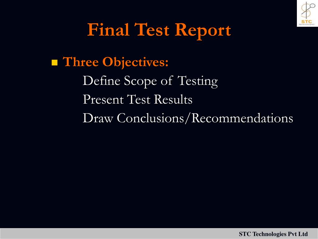 Final Test Report • Three Objectives: Define Scope of Testing Present Test Results Draw Conclusions/Recommendations