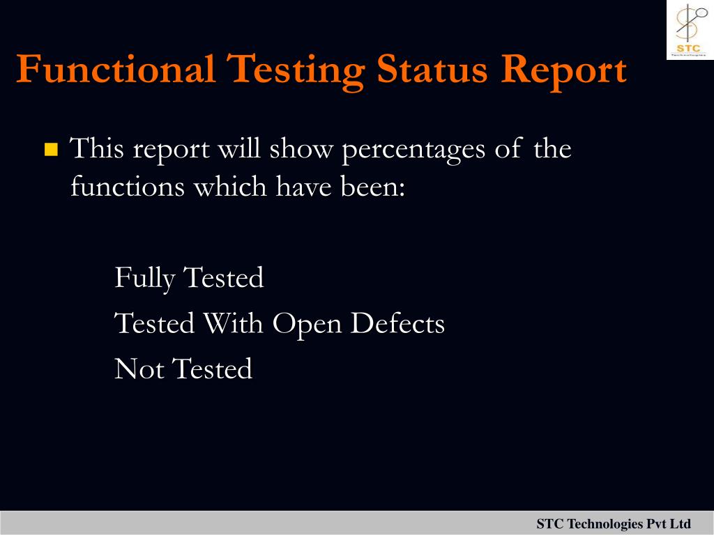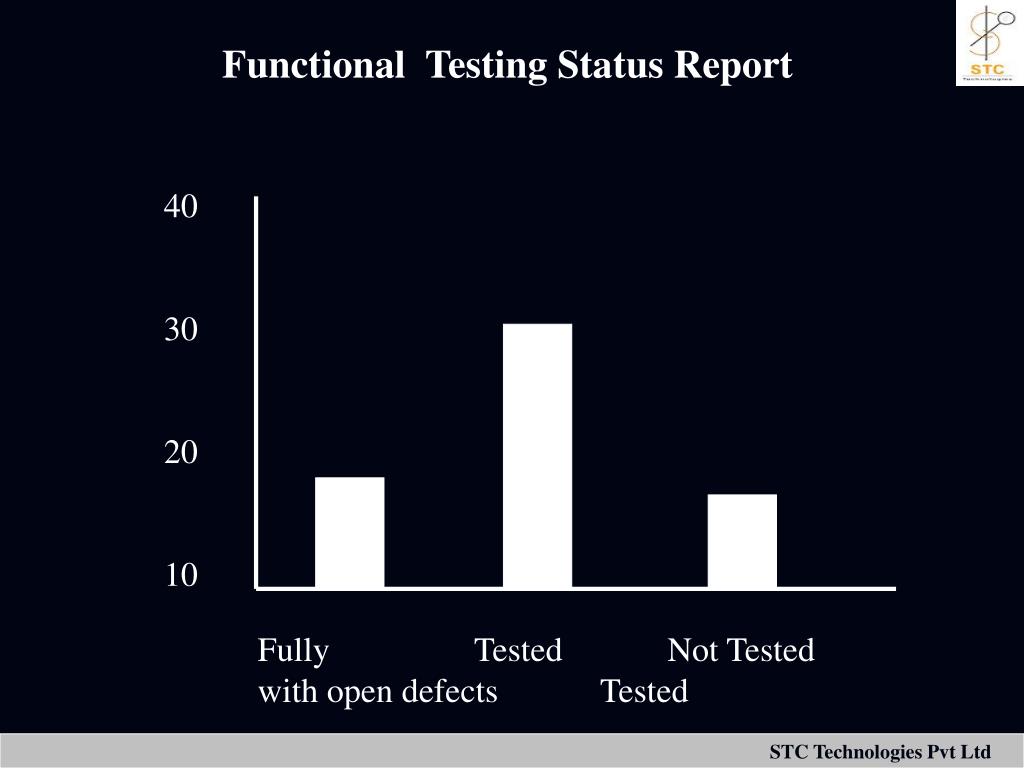 Functional Testing Status Report • This report will show percentages of the functions which have been: Fully Tested Tested With Open Defects Not Tested