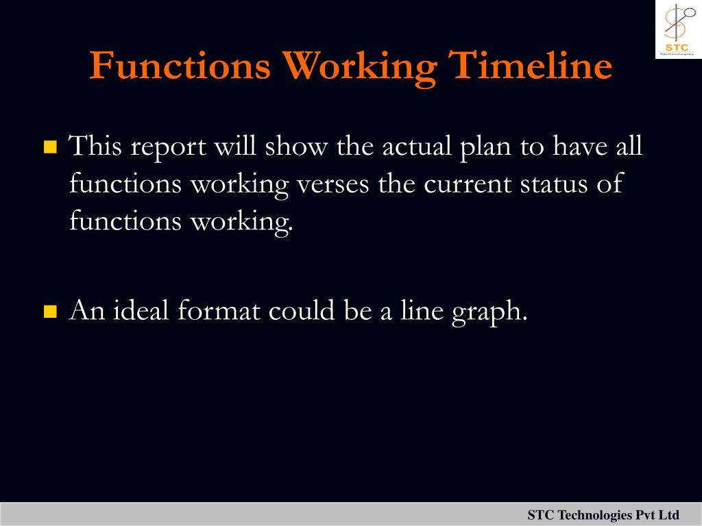 Functions Working Timeline • This report will show the actual plan to have all functions working verses the current status of functions working. • An ideal format could be a line graph.