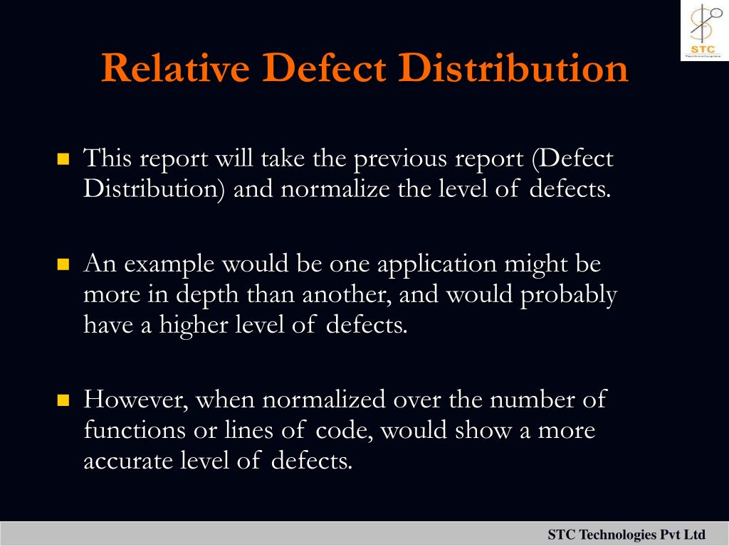 Relative Defect Distribution • This report will take the previous report (Defect Distribution) and normalize the level of defects. • An example would be one application might be more in depth than another, and would probably have a higher level of defects. • However, when normalized over the number of functions or lines of code, would show a more accurate level of defects.