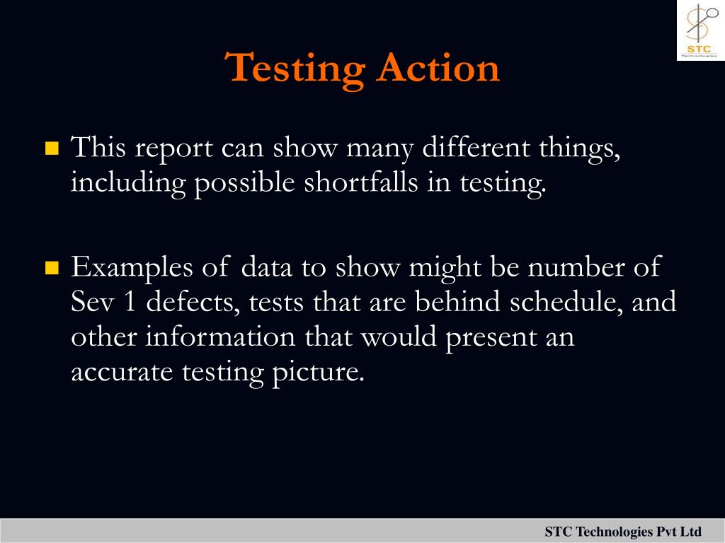 Testing Action • This report can show many different things, including possible shortfalls in testing. • Examples of data to show might be number of Sev 1 defects, tests that are behind schedule, and other information that would present an accurate testing picture.