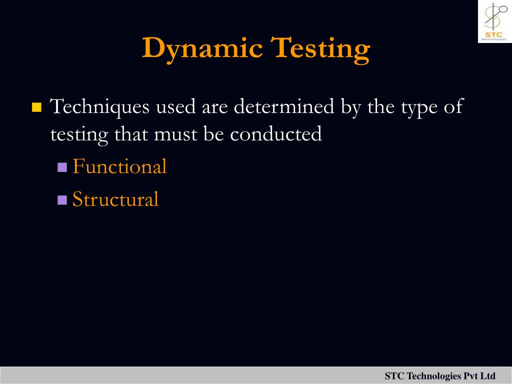 Dynamic Testing • Techniques used are determined by the type of testing that must be conducted • Functional • Structural